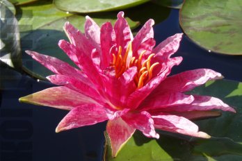 Это великолепный неординарный сорт, в котором сверкающие красные цветы дополняются пятнистыми листьями. Прекрасный выбор для прудов среднего размера.